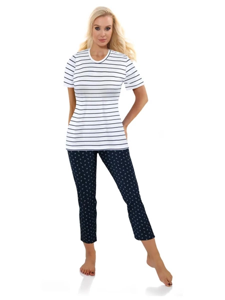 Sesto Senso Damen Pyjama Set – Bequeme Baumwolle, Kurzarmshirt mit V-Ausschnitt, 3/4 Hosen mit Blumenmuster, Atmungsaktiv und Elegant, Ideal für Zuhause und Schlafen, Blau